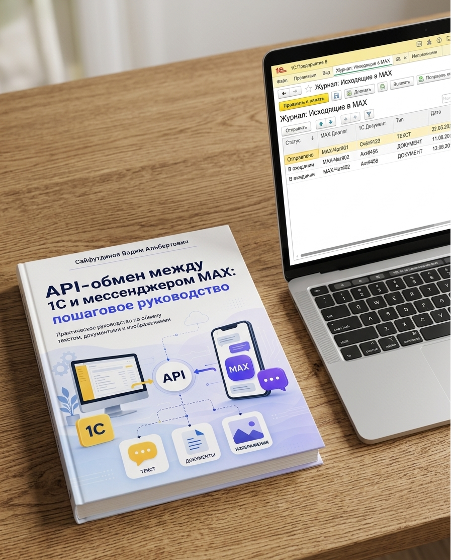 Эта книга — готовое практическое руководство по настройке двустороннего обмена сообщениями и файлами между 1С:Предприятие и мессенджером MAX через сервис Green API. Вы получите работающие обработки, модули и итоговую конфигурацию.